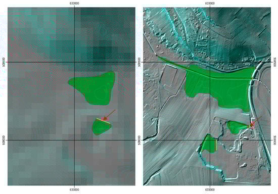Comparison of the results in a characteristic scene of the study area. The spatial resolutions are 40 m (left) 1 m/5 m (right). The extents of the large polygon in the north vary significantly due to the smoothing in the coarser model. For the smaller polygon in the south, the extents are at least similar, but the dam is placed in a completely different way concerning both, position and extents (see red arrow). The third polygon in a very flat area is not detected in the coarse model.