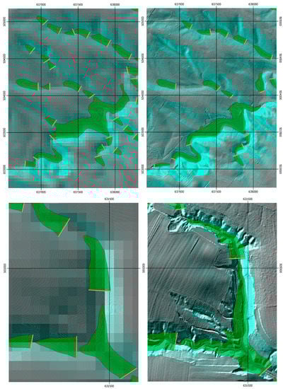 This dependency on spatial resolution and terrain characteristics can be observed in Figure 6, Figure 7 and Figure 8 where the different results are compared for various parts of the study area. Not having the possibility to profit from favourable small-scale terrain features like valley constrictions, the polygons resulting from the 40 m model are less efficient with clearly more extensive dams limiting similar or only slightly larger retention areas (q.v. Table 2). This can be seen for the smaller lake in Figure 7. The dam in the 40 m model would be placed where actually a sharp natural barrier is visible for higher resolutions. Contrarily, the undulating terrain in Figure 8 results in much smaller differences concerning dam length and placement.