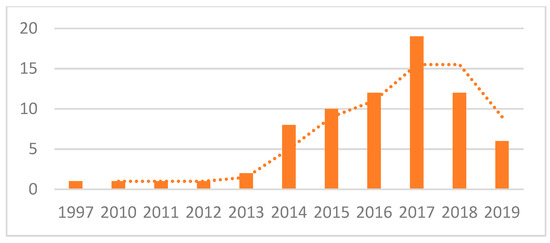 The research produced a selection of 81 documents: after an analysis of the entire text of the publication a total of 73 publications in line with the research objectives were chosen for in-depth analysis and were collected in an excel database. The range of publication years of the works analyzed is between 1997 and 2019, including the works already published to date (Figure 1). The only article published in 1997 [27] is a pioneering work on spatial group choice that could not rely on today’s technologies for creating and modifying spatial data by non-expert users. Therefore, it can be said that a continuous and growing scientific production on the issues related to PPGIS in the field of transport can be placed starting from 2010.