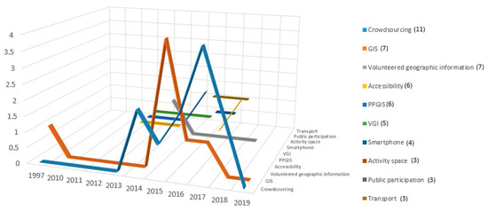 Keyword analysis can support the identification of the main areas of application since they are used by the authors to help indexers, search sources and consequently readers to find relevant papers; they generally represent the content of the manuscript and are quite specific to subject’s field or sub-field. From the analysis of the keywords of the papers of the review (Figure 2), conducted through pivot tables, beyond the terms included in the search strategy (GIS, VGI, PPGIS, Crowdsourcing and Transport), the words “Accessibility” [28,29,30,31,32,33], Smartphone [34,35,36,37,38] and “Activity Space” [39,40,41] emerge.