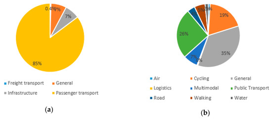 The work subjects of the review are classified according to the topic dealt with in four major categories according to the studies topic (Figure 3a): Passenger, Freight, Infrastructure and General: 78% of the articles analyzed are studies relating to passenger transport, 9% to infrastructure, 12% to general issues, while only 1% relates to freight transport. In terms of transport mode (Figure 3b), one third of the studies can be classified in the general category, followed by cycling (18%), multimodal transport (16%), public transport (14%), walking (9%), while the remaining categories get percentages below 5% (Air 2%, Logistics 1%, Water 4%, Road 3%).