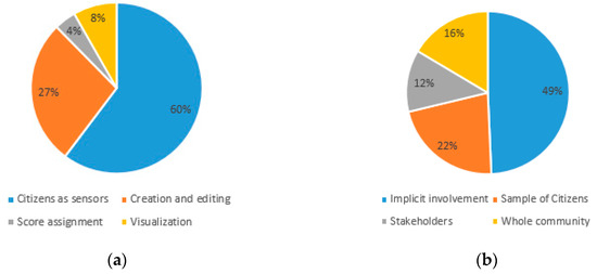 The studies analyzed revealed different levels of use by users, in terms of direct or indirect involvement in the creation of geographical data (Figure 4a).