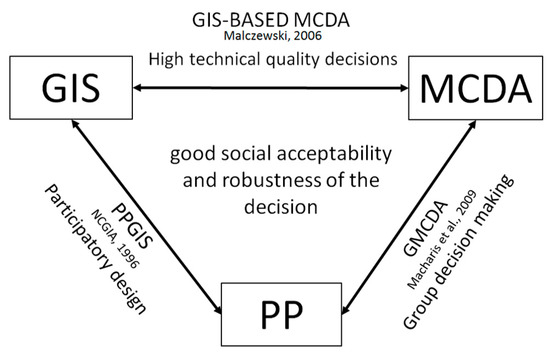 Triangle of integration of GIS, Public Participation and MCDA in the transport decision-making process (adapted from [111]).