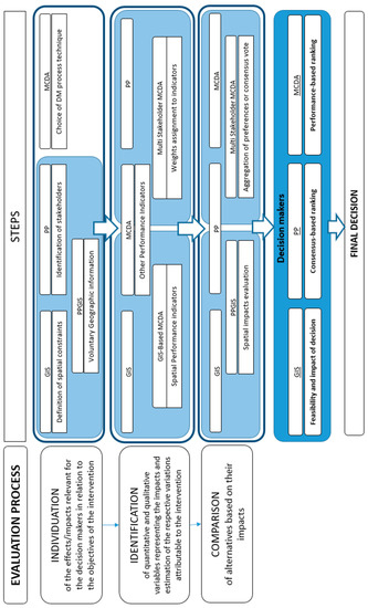 In recent years, MCDA has been widely used in the evaluation of territorial policies, due to the complexity of the issues and the inadequacy of traditional methods to capture all the possible impacts, such as in the case of cost–benefit analysis [106]. It has also been extended to group decisions (group MCDA—GMCDA), including the viewpoint of multiple stakeholders, allowing them to participate in the evaluation of alternatives and criteria [6,66,107,108].