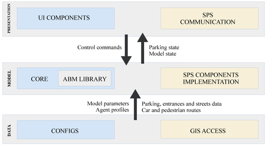 Simulator’s layered organization. SPS = smart parking systems; GIS = Geographic Information Systems; ABM = Agent-Based Modeling.