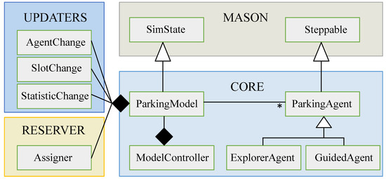 Figure 2 provides an overall, simplified view of the Model layer design, which includes model notifications, agents’ behavior, model configuration and smart parking artifacts implementation. Any component interested in receiving notifications of model changes must subscribe to the appropriate updater. Distinct agent behaviors are achieved through the basic parking agent specialization. The SPS’s reservation component, though it is known and used by the simulator, is implemented independently from the simulation core, thus allowing for easy substitution. By implementing model controllers it is possible to set up the necessary relations, e.g., updaters, according to the target application platform.