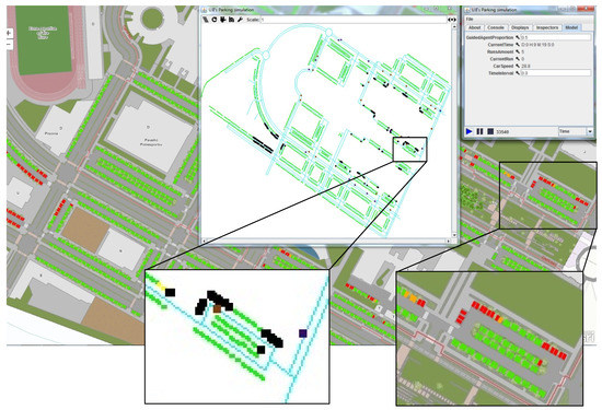 One of the simulator applications running in the foreground, while in the background a web map shows the parking spots’ current status as stored in the SPS. In the simulator, black squares represent parked agents. In the web map, red squares represent occupied parking spots.
