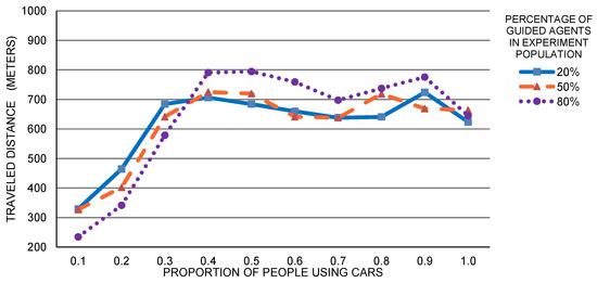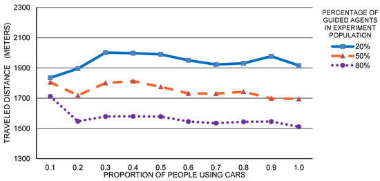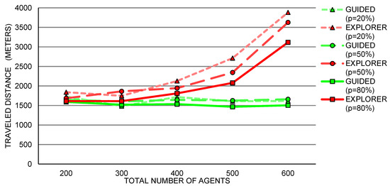 To study a specific high parking demand situation, e.g., in the case of a notorious event hosted in a campus facility, we ran simulations for which agents tried to park near a randomly chosen entrance of a particular building during a ‘virtual’ day period. We made them arrive at the campus at similar times. The parking demand significantly exceeded the parking supply around the building, and the agents had to park around other buildings. As presented in Figure 9, in the case of the ‘Explorer’ agents, the worst result corresponds to the proportion of ‘Guided’ agents , which is a result not only from competition, but also from the fact that the ‘Explorer’ agents that try to park near the same building’s entrance follow similar routes while searching for parking, which makes them go through the least favorable paths. In the case of the ‘Guided’ agents, the worst results correspond to the proportion , which corresponds to when they are the most affected by the reservation guarantee problem.