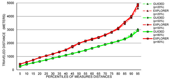 Difference in traveled distance between ‘Explorer’ and ‘Guided’ agents, as seen using percentiles and considering p = 20%, p = 50%, and p = 80%.