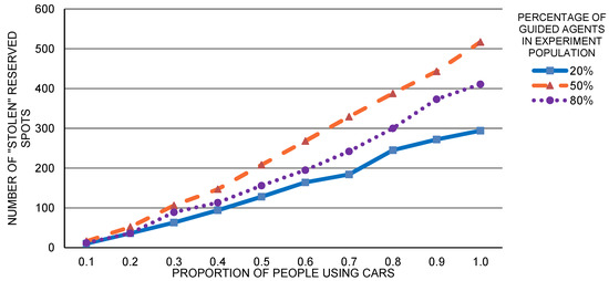 In our model, the driver’s travel distance while trying to park might be affected not only by the driver’s parking choice, destination, and parking availability. An agent that does not use our SPS may occupy a parking spot already reserved for another agent, forcing the latter to issue a new spot reservation. The effects of reservation without a physical guarantee, i.e., nothing stopping a driver from grabbing someone’s reserved spot, are not explored in the literature we reviewed, though reservation guarantee is a key aspect of SPS [5]. The literature does suggest approaches to enforce the reservation, but they are either relatively expensive (physical barriers) or not fully effective [2,5,32]. Section 5 shows how we explored the reservation guarantee problem, and comments on the negative impact it may have for the SPS’ usage. To the best of our knowledge, no previous study has hinted on the level of SPS utilization under which the reservation guarantee problem is the most notorious for a given environment.