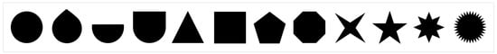 The study’s stimulus material comprised of 12 paper cards, each showing one two-dimensional geometric shape at a size of 1.7 x 1.7 cm, with the exception of the semicircular shape due to its semi-size nature. All shapes were displayed in black on a white paper background. Full shape filling in black aimed to control for responses towards the shape’s qualities and to preclude similarity judgments based on color associations. Geometric shapes were systematically created by increasing complexity, i.e., by increasing the number of vertices of an initial point-shape. As such an approach could result in an infinite number of shape variations, the number of stimuli was limited to a set of commonly used shapes [,]. As a result, a set of 12 geometric shapes was selected and further used in this research study (Figure 1).
