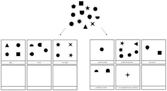 After the free-sorting task was completed, each participant was instructed to retrospectively verbalize their decisions (task 2) and to further label each group by its core characteristics (task 3). Responses from both tasks were subjected to a qualitative content analysis [,] to further uncover core processes and strategies from the collected data across participants. In particular, a reductive content analysis approach was applied, in which “the category systems are developed inductively out of the concrete material” [] (p.13). The analysis was performed manually, in a systematic, sequential, and iterative process, following the sub-procedure of inductive category formation proposed by Mayring [,].