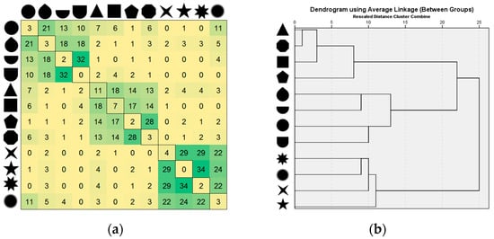 In the next step, a hierarchical cluster analysis was performed based on the co-occurrence matrix in order to statistically identify clusters of shapes with similar qualities. The statistical software package SPSS was used to analyze the matrix []. An agglomerative clustering approach was applied, which starts with each item as its own cluster and progressively links them based on their estimate of distance to one another (for detailed results see Supplementary Materials Table S1). A cluster distance measure of average linkage was employed, which balances the limitations of single and complete linkage methods, i.e., using information about all pairs of distances to assign cluster membership, not just the nearest or the farthest item pairs. Results indicate a three-cluster solution (see dendrogram Figure 3b). The dendrogram revealed one cluster comprised of polygons, while round and partly round shapes fall into cluster two. Star-like shapes fall in cluster three. Moreover, the cluster analysis dendrogram indicates that round shapes (cluster one) and polygons (cluster two) belong to a shared meta-cluster (Figure 3b).
