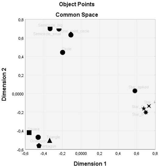 MDS was applied to reduce the complexity of the data set and permit a visual appreciation of the underlying relational structures. Through MDS, distances between items are quantified and proximities and relations revealed. The outcome of MDS is a dimensional space that conveys relationships among items, wherein similar items are located proximal to one another, while dissimilar items are located proportionately farther apart []. Thus, proximities between the geometric shapes were calculated based on the 12x12 co-occurrence matrix composed previously, resulting in 66 similarity counts (k items, (k * (k − 1)) / 2). The co-occurrence matrix was subjected to a PROXSCAL scaling algorithm to disclose the spatial relationship between the geometric shapes, treated as ordinal data. A scree plot was computed to determine the appropriate number of dimensions, indicating a two-dimensional configuration (see Supplementary Materials Figure S1 and Table S2). Figure 4 illustrates the two-dimensional space and the relationships between the 12 geometric shapes used in this study (see Supplementary Material Table S3 for detailed coordinates of each shape). Similar shapes are located proximal and dissimilar shapes are located distant from one another. Results support the previous findings of a three-cluster solution, while further distinguishing the individual proximities between as well as within each cluster, in more detail.