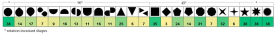 In the free-sorting task 1, participants were instructed to freely group the set of 12 geometric shapes by similarity. In doing so, participants were also free to alter the shapes’ orientations – despite not being explicitly instructed to do so. The tendency to rotate shapes, which can change the character of shapes [], emerged frequently during the free-sorting task. In order to analyze this behavioral pattern in more detail, the visual protocols derived from free-sorting were subjected to a rotation frequency analysis, aiming to identify, quantify, and compare shapes which were more – or less – prone to rotation behavior. For this purpose, each visual protocol and each shape were examined individually by the experimenter to identify the orientation of each shape. A coding scheme was applied based on Arnheim [] and all shapes assigned to a matrix according to one of the following orientations: (a) 90° rotation for shapes with fewer than four vertices, (b) 45° rotation for shapes with four or more vertices, and (c) rotation invariant shapes. Figure 5 illustrates the frequencies of shape orientations for each of the 12 geometric shapes based on the shape orientation scheme and responses from all 38 participants.