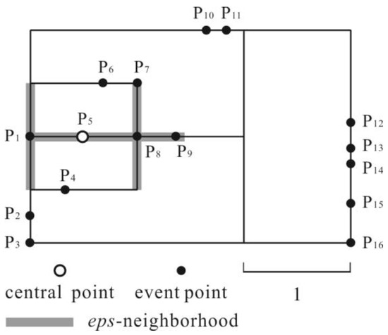 Figure 1 is a simulated dataset used to explain the cluster detection for network events. Starting from an event point p, the part of the network that can be reached within a distance eps is p’s eps-neighborhood; p is a central point, and the event points within p’s eps-neighborhood are p’s eps-neighbors N_eps (p). The number of neighbors is defined as the density of p. In Figure 1, the density of P5 is 4.