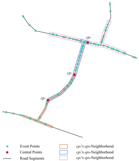 Figure 2 shows how the density ordering graph was obtained and how it reflected the density distribution of event points. The NS-DBSCAN algorithm randomly selected an event point as the central point. Irrespective of which event point was selected first, the NS-DBSCAN algorithm went straight to the peak of local density and visited every event point around it. Figure 2 shows that cp1 was assumed to be the first one to be selected as the central point. In cp1’s neighborhood, cp2 was the highest-density point and hence was chosen as the next central point. Also, cp3 was chosen as the next central point after cp2 and was the density peak of this region. When the peak was reached, the algorithm visited the event points around it and recorded their densities from high to low in the density ordering table. This procedure stopped when no event point was reached within the search window defined by eps. Moreover, the algorithm randomly selected one of the points that were not in the density ordering table as a new central point. In this way, the bars of density ordering graph usually started with a peak and went down gradually until it encountered another peak. An implicit cluster was likely to appear between the two peaks. Therefore, the density ordering graph was able to depict the density distribution of event points and even indicated the intrinsic clustering structure.