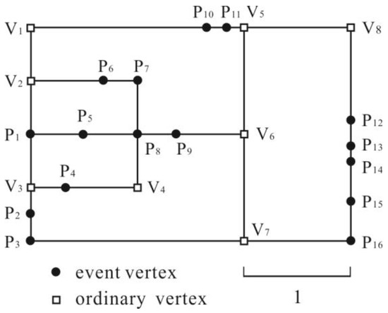 In the network shown in Figure 3, eps = 1. P5 was randomly selected as a central vertex. The eps-neighborhood of P5 was obtained as follows. The algorithm first set CDCV(P5) = 0 and CDCV (other vertices) = ∞. The basic expansions from P5, that is, P5→P1 and P5→P8 took place, after which CDCV (P1) = 0.5 and CDCV (P8) = 0.5. P1 and P8 became the start vertices in the next expansion, for P1: P1→V2, P1→V3; for P8: P8→P7, P8→P9, and P8→V4. The expansion continued with V2, V3, P7, P9, and V4 as the start vertices until all the expansion paths were blocked. The event vertices whose CDCV were neither ∞ nor 0 constituted the eps-neighbors of P5, which were P1, P6, P7, P8, and P9.