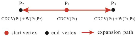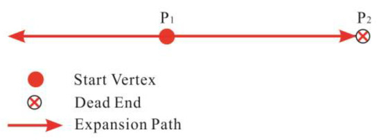 Dead-end roads do not have any impact on the study. In a real dataset, dead-end roads do not intersect with other roads on one side or on both sides. Figure 13 demonstrates the dead-end side of a road and the basic expansion from P1 to the dead-end vertex P2 (usually an ordinary vertex). CDCV (P2) was updated to CDCV (P1) + W (P1, P2), and hence was greater than CDCV (P1). P2 became the next start vertex and the basic expansion from it went nowhere because the expansion path from P2 to P1 was blocked. In this situation, no other vertices were influenced by the dead-end vertex.