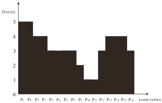 where Id represents the identifier of event point, Density is its density, and N_eps is its eps-neighbors. A noteworthy phenomenon was that the density of an eps-neighbor was similar to its central point and it was likely to be gathered at the same cluster. Hence, if the local density peak was first visited followed by its surrounding event points, the order of event points in the density ordering table indicated implicit clusters. The density ordering graph of road network in Figure 3 is depicted in Figure 5.