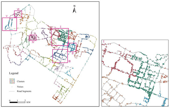 Clusters of hierarchical clustering algorithm in Figure 10 delineated some high-density regions (II, III, IV, V, and VI) and the sparse POIs were also gathered to clusters. As amplified in Figure 10, region I was divided into two separate parts, although it was highly aggregated visually. The algorithm divided the dataset into several clusters according to their distances, without considering their density distribution. Although the clustering results were sensitive to the cluster number, the algorithm was still capable of delineating the density distribution of dataset as long as the cluster numbers were suitably set.