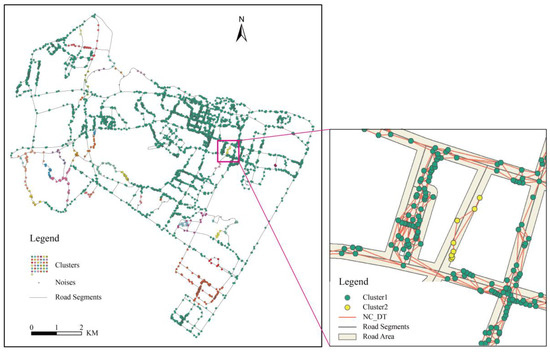 Figure 11 shows that the NC_DT algorithm did not perform effectively for this dataset; it gathered 89% of POIs into a giant cluster and many small clusters appeared mostly in the less-dense regions. It was not suitable for the dataset because the distances between some event points might be exaggerated due to the disconnectedness of NC_DT. As a consequence, the parameter determined by the statistical method based on the distances of event points might be invalid. For example, the POIs in the amplified region of Figure 11 should be in the same cluster. However, they were separated into two different clusters because the points in different clusters were not connected by NC_DT. In fact, most small clusters were formed where NC_DT was disconnected. A possible remedy is to add all the interaction and inflection points of road segments into a distance matrix and distinguish these points from event points while clustering. However, this inevitably adds to the high time and space complexity of algorithm. Therefore, the NC_DT algorithm was recommended in very dense event points, in which case the effect of disconnected NC_DT could be largely avoided.