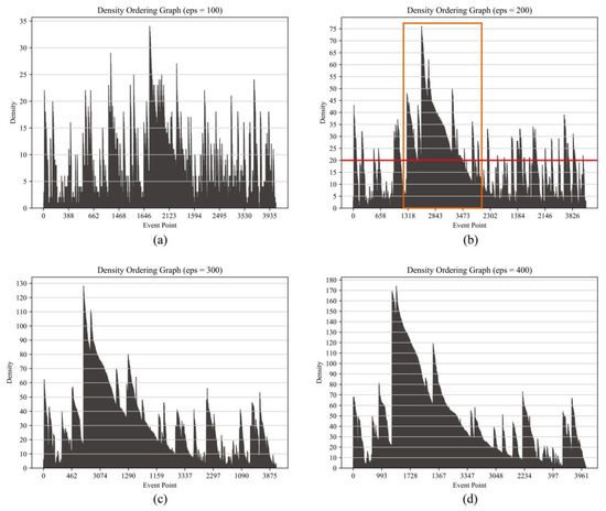 Density ordering graphs of (a) eps = 100; (b) eps = 200; (c) eps = 300; and (d) eps = 400.