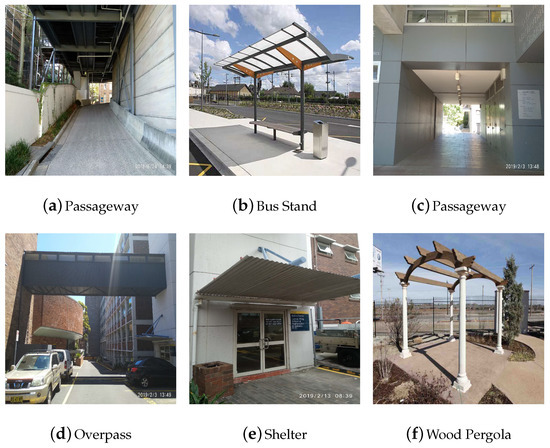 Figure 1a,b shows two top-bounded spaces, but the former has sides, and the latter does not. A variety of structures can act as the source of top(s), e.g., indoor environment (Figure 1c), bridge (Figure 1d), or shelter (Figure 1e). Furthermore, the function of top(s) can be different; some of them can help agents escape from rain or strong sun (Figure 1a–e), but others cannot (Figure 1f).