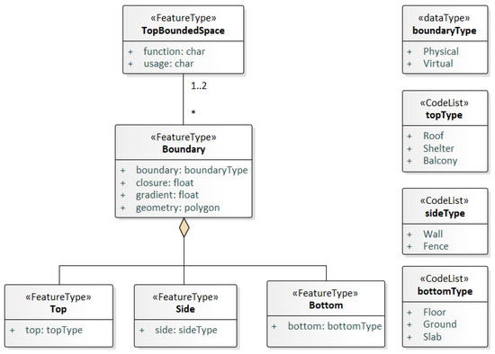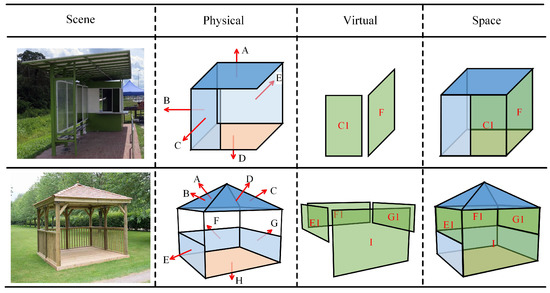 Top, Side, and Bottom are three indispensable elements (Boundary). Generally, structures such as Roof, Shelter, and OuterCeilingSurface (defined in CityGML [46]) can act as the tops, while Wall, Fence, Door, etc., are considered the sides, and Floor and Ground/OuterFloorSurface can be the bottoms. At least one physical Top (with qualified closure) should be included. Surely the Bottom is physical and has qualified closure, while physical Sides are not specifically required, since side structures are not necessary for a top-bounded space, as they can float over or sink into the ground surface (terrain).