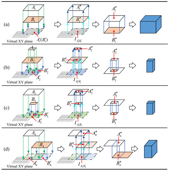 Figure 4 illustrates the determination of boundaries and the creation of top-bounded spaces between two polygons and includes four different cases. The original polygons are A and B, and all steps happen only between them. Assuming their projections are and , respectively, the relationships of their projections are , , , and (sub-figures in the first column). Then, the overlaps of their projections () are computed by intersection, i.e., , , , and (sub-figures in the second column). The third step is to project the overlaps (, , , and ) back to the original polygons along the Z-axis; then, top(s) and bottom(s) can be calculated: {}, {}, {}, and {} (sub-figures in the third column). and are parts of polygons A and B, respectively, acting as top and bottom. Projections of and are equal to . Because our approach relies entirely on the Z-direction as the projection direction, the last step is to match the top and bottom directly to obtain the missing lateral polygons (sides) that allow forming closed volumes (sub-figures in the last column). In addition, these operations are applicable to polygons that are not horizontal (inclined cases), but the vertical cases are not, as the projections of vertical components on the Z-direction are lines rather than polygons.