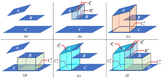 Figure 5 illustrates the space creation and trimming among three polygons, in which the polygons B and C are horizontal, while A is inclined. Suppose polygon A is an inclined roof, B is a floor slab, and C is the ground. Repeating the four steps described in the last section three times, three top-bounded spaces are created, whose tops and bottoms are , , and (Figure 5b–d). The space bounded by has overlaps with other two, thus it is trimmed by the spaces shown in Figure 5b,d, and the trimmed result can be seen in Figure 5e, whose top and bottom are . Thus, three final top-bounded spaces, whose top(s) and side(s) are , , and , are created without overlaps (Figure 5f).