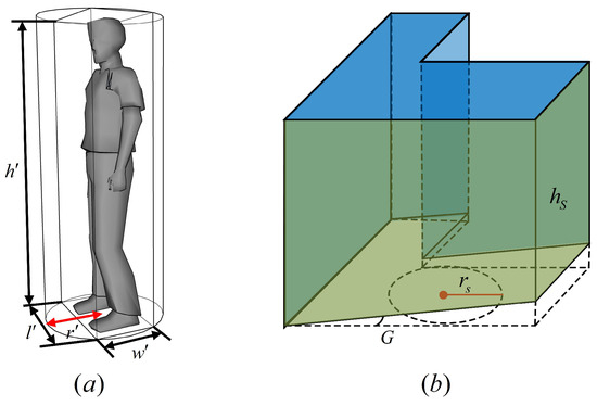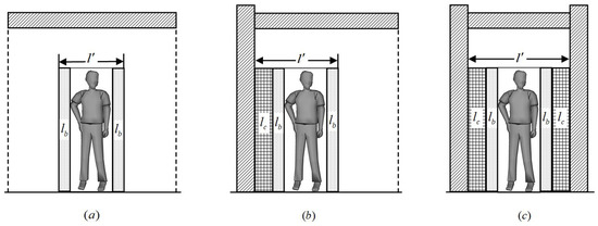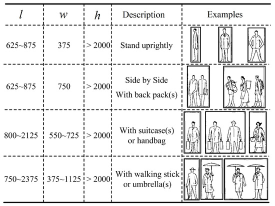 A pedestrian is regarded as a moveable 3D object with length (), width (), and height (). All the size units in this paper are expressed in mm. The dimensions of the required spaces for different cases (Figure 9) can be estimated based on the data in Man: The Universal Standard [47].
