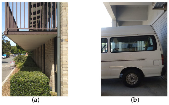 Although some top-bounded spaces exist, not all of them are available when considering the accessibility attribute. This attribute can be classified into a property issue and an object issue. The property issue means that top-bounded spaces are usually public but that some of them are private, for instance, the building with balconies in Figure 8a. Obviously, there are two top-bounded spaces: one is formed by the roof and outer floor, and the other is formed by the ground and the outer ceiling. Generally speaking, the former cannot be used in the navigation model/system, as this space is private and only the house owner can use it, while the latter can be public. The object issue is that some top-bounded spaces may be occupied by some objects. For instance, people may place something in a top-bounded space for some purpose, e.g., grow plants (Figure 8a) or park a car (Figure 8b).