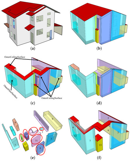 A 3D building model and creation of top-bounded spaces: (a) the original 3D model; (b–d) the thirteen top-bounded spaces generated by the proposed approach; (e) the unqualified top-bounded spaces, which are marked by red circles; and (f) the qualified top-bounded spaces.