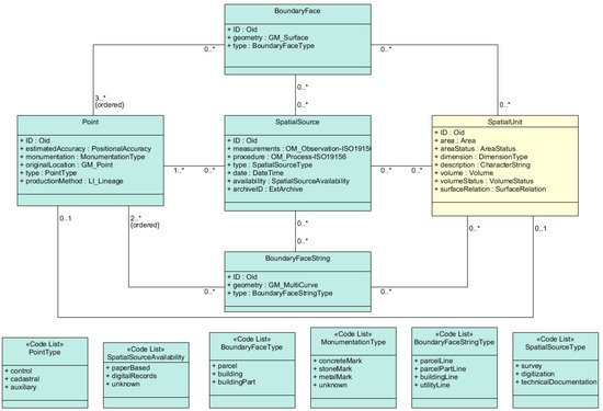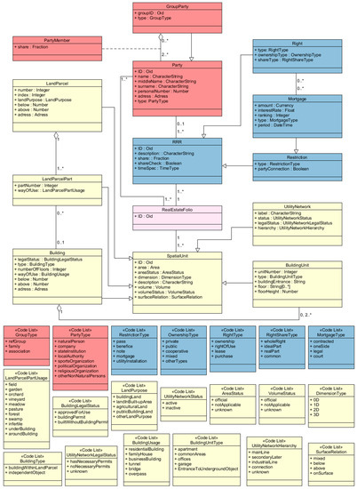 Figure 2 provides an overview of the main classes of the data model. The classes are organized in groups (packages of LADM standard), i.e., Party Package (red), Administrative Package (blue) and Spatial Unit Package (yellow). In the case study, some data model classes are implemented into a physical model as MongoDB collections (see Section 2.2).