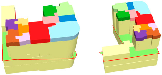 As previously explained (Section 2.4), existing data sources, such as floor plans and cross-sections, were used for creating multi-surfaces of building units. In this particular case, there were enough existing data to create 3D geometries of building units. This case study also includes land parcels and heights at border points. Data on land parcels were also created based on existing data sources and web services [35,36].