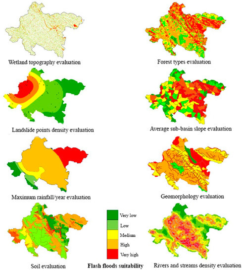 In river basins, to develop a map of flash-flood and mud-flood risks, factors such as landslide, maximum rainfall, the cumulative value of surface topography, surface characteristics, soil characteristics, the weathered shell of the surface and the average slope of tributaries are included as the input data for the analytical model, constructed with a detailed level of research [12,18].