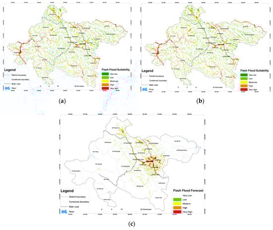 Results of flash-flood forecast processing by rainfall in Thuan Chau district: (a) Forecast rainfall map, (b) flash-flood risk map and (c) early flash-flood forecast map by the forecast rainfall, with a flash flood generation threshold of 150 mm/d [13].
