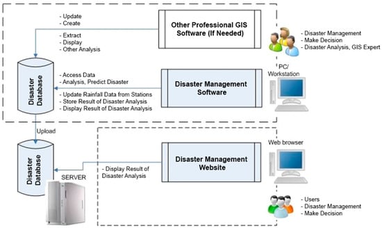 The software was developed using the open source programming language Python, Personal Home Page (PHP) and the PostgreSQL/PostGIS database [27]. The software was simply organized using the key functions: Environmental Systems Research Institute (ESRI)-standardized database management, spatial interpolation of rainfall and integration of information layers to formulate a flash flood forecast map and the map was exported in the form of data and metrics. From the software, information is transferred to the website to provide information online and export messages to users.