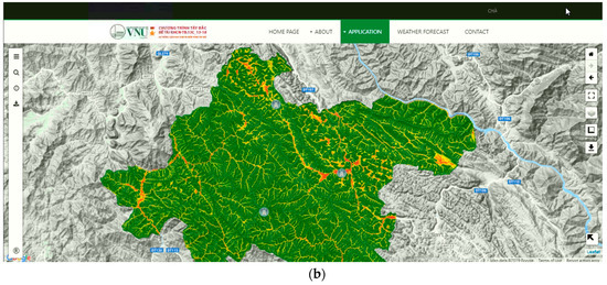 In natural disaster management, a flash flood warning system [28] can be a single integrated piece of software or can also include software and webpages operating in different phases (Figure 9a,b). However, they should meet three basic functions: quick processing of forecast rainfall data, rapid provision and communication about possible locations of disasters for concerned people in message form. The development of an early-warning system should follow both technology and application directions [29,30]. At present, the model has been tested and aligned to produce forecasts close to reality.