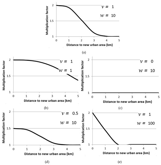 where is the multiplication factor to increase land values at cell ; and are parameters of the Gaussian function regulating the sensitivity of decreasing rate; denotes the distance between cell and the location where new development occurs; and denotes the maximum distance where land value change occurs due to the new development. The Gaussian function was selected based on our observation that the increasing rate of land value appears to be uniform within 1 km from a new urban area, but reduces in scale beyond 1 km and diminishes from 5 km and beyond. Using a trial-and-error approach, we tested different and values in Gaussian function to identify the optimal values (Figure 3a) that match the land value market change in the JMA (Figure 3).