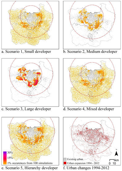 The simulation results suggest that the locations and new urban forms are generated by different processes and actors, and concurs with the current scholarship [2,10]. Developers with large capital reserves are also able to leverage further funds through lending to maximise their capital return. These larger developers are capable of selecting land in the most profitable locations on the outskirts of the JMA, and in doing so have the greatest potential to transform large areas of nonurban land to urban use. In contrast, developers with less capital reserves choose smaller blocks of land to develop, resulting in a fragmented distribution of new urban areas.