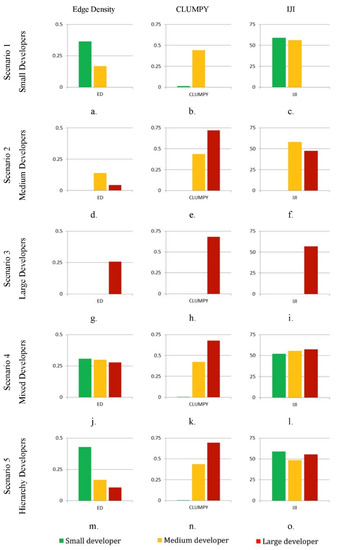 The diverse spatial patterns of simulated urban form under the five development scenarios could be quantified using landscape matrices, including Edge Density (ED), Clumpiness index (CLUMPY) and Interspersion and Juxtaposition index (IJI) [54,55]. It can be confirmed that urban areas developed by small developers display a small and disconnected shape as indicated by high ED and low CLUMPY (Figure 5a,b). Large developers produce a more connected urban pattern as indicated by high CLUMPY (Figure 5g). When all types of developers appear on the market, the spatial pattern of new urban areas has little dissimilarity as shown by IJI, indicating a more mixed and complicated urban form across JMA (Figure 5l,o).