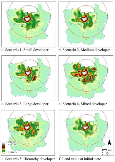 Figure 6 shows the simulated land value changes as the consequences of new urban development. The simulated new urban development largely occurs in locales between 20 and 25 km from Jakarta’s CBD and remains consistent across all scenarios. However, the amounts of land value changes vary spatially under different scenarios. Compared to the land value map at the initial state in 1994 (Figure 6f), marginal land value increase was observed on the simulated land values due to the impact of small developers (Figure 6a) in areas about 25 km away from the Jakarta’s CBD. This increase in land values under Scenario 1 is attributable to the small developers’ preference to select small piece of land (i.e., one cell which equals to 9 ha) to develop, resulting in more disperse, uncontrolled or unplanned urban spatial structures, which are typical features of sprinkling [56]. In contrast, medium and large developers select large pieces of land for development, usually more than 10 ha with locations close to one another. As a result, development by such developers creates an accumulated increase in land values, as observed in southeast Jakarta (Figure 6b,c). With the competition between multityped developers introduced in the land market (Scenarios 4 and 5), the increase in land values are much higher than those under the scenarios of single-type agents (Scenarios 1–3), with particularly observable outcomes in the south and west of Jakarta (Figure 6d,e).