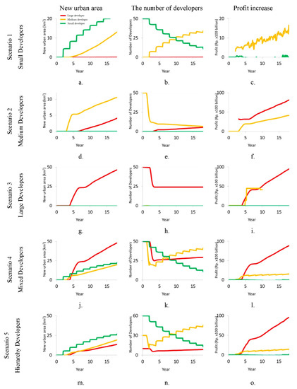 Profit gains tend to be accumulated by large developers much faster (Figure 7, right panel) and are less related to the amount of acquired urban areas. For example, in Scenario 1, regardless of the size of urban areas, small developers gain marginal to no profit (Figure 7c), while under Scenarios 4 and 5, where mixed-typed developers coexist, large developers also display the highest increase in profit, followed by medium and then small developers (Figure 7l,o).