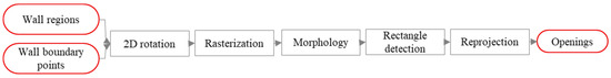 37], in which closed doors were extracted from color images, in this work, no color information is surveyed, and the reconstruction of openings is based on the detection of holes in wall regions.