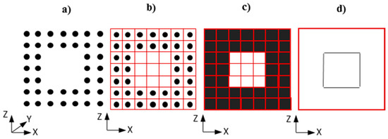 Figure 3b). For this purpose, a rectangular matrix is created, and pixels are assigned a value of either one or zero depending on whether or not any points fall inside the pixel (