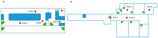 31]. Each node in the graph represents a point location, and each edge represents a visible connection between them. The proposal considered the presence of obstacles but as a set of 2D points, for example, from computer-aided design (CAD) files or 2D floorplans. Also, considering the 2D representation of indoor environments, a formal definition of an indoor routing graph was presented by Reference [