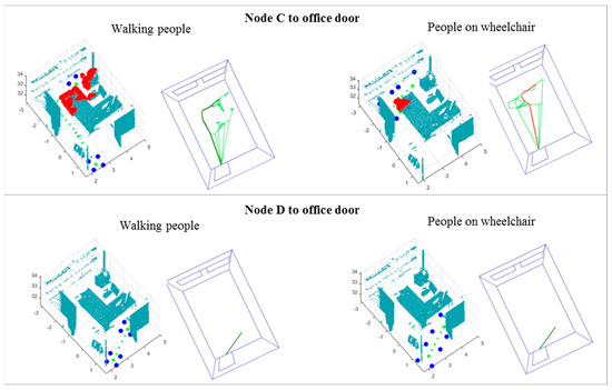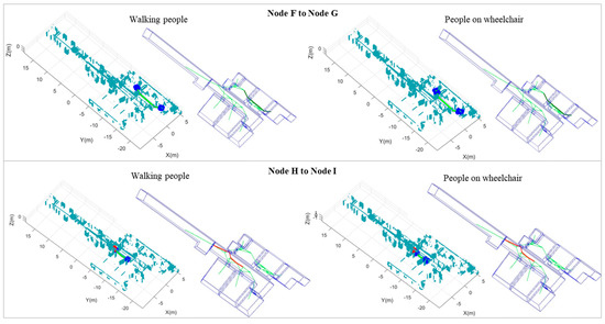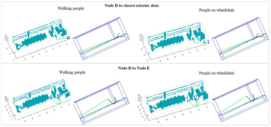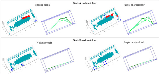 Similar to the update of highly autonomous driving maps for autonomous vehicles, the methodology is based on the concept of updating the network from the use of point clouds. Obstacle detection is dependent on data completeness. The better the scene is depicted, the more accurate the paths are that are obtained. However, the methodology is not dependent on the complete acquisition of the entire building, since the correction of paths is considered just for the immediate area of the path instead of for the entire scene. In this way, although the paper is not conceived for a real-time application, it could be used for pathfinding with mobile laser scanning data as the input, such as for the case of autonomous wheelchairs. The distinction of dynamic and static obstacles is not considered in the methodology; however, this is an important topic for the generation of highly detailed 3D indoor maps. Consequently, this topic will be considered for future work.
