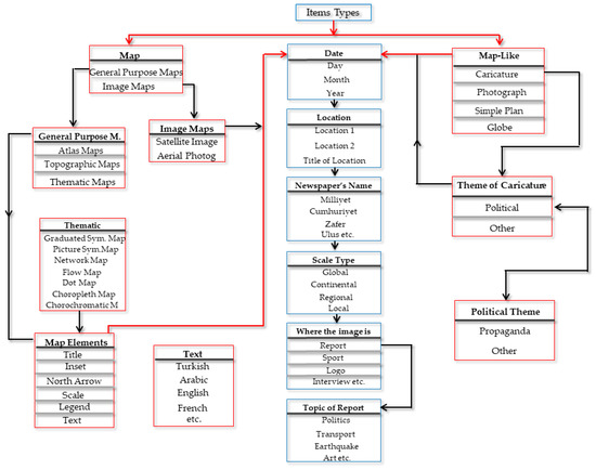 For these purposes, in the main study, we collected map and map-like items from selected newspapers in the study period (1928–2000) and classified them according to their spatial and thematic features to construct a web-based and geo-spatial database which was introduced for the first time in Turkey to share with researchers. Therefore, in addition to a thematic analysis, certain cartographic parameters such as “map types” and “map elements”, which were determined according to cartographic references [1,10,11,12,13,14], were analyzed through the database (for detailed information: mentioned in Section 2.1).
